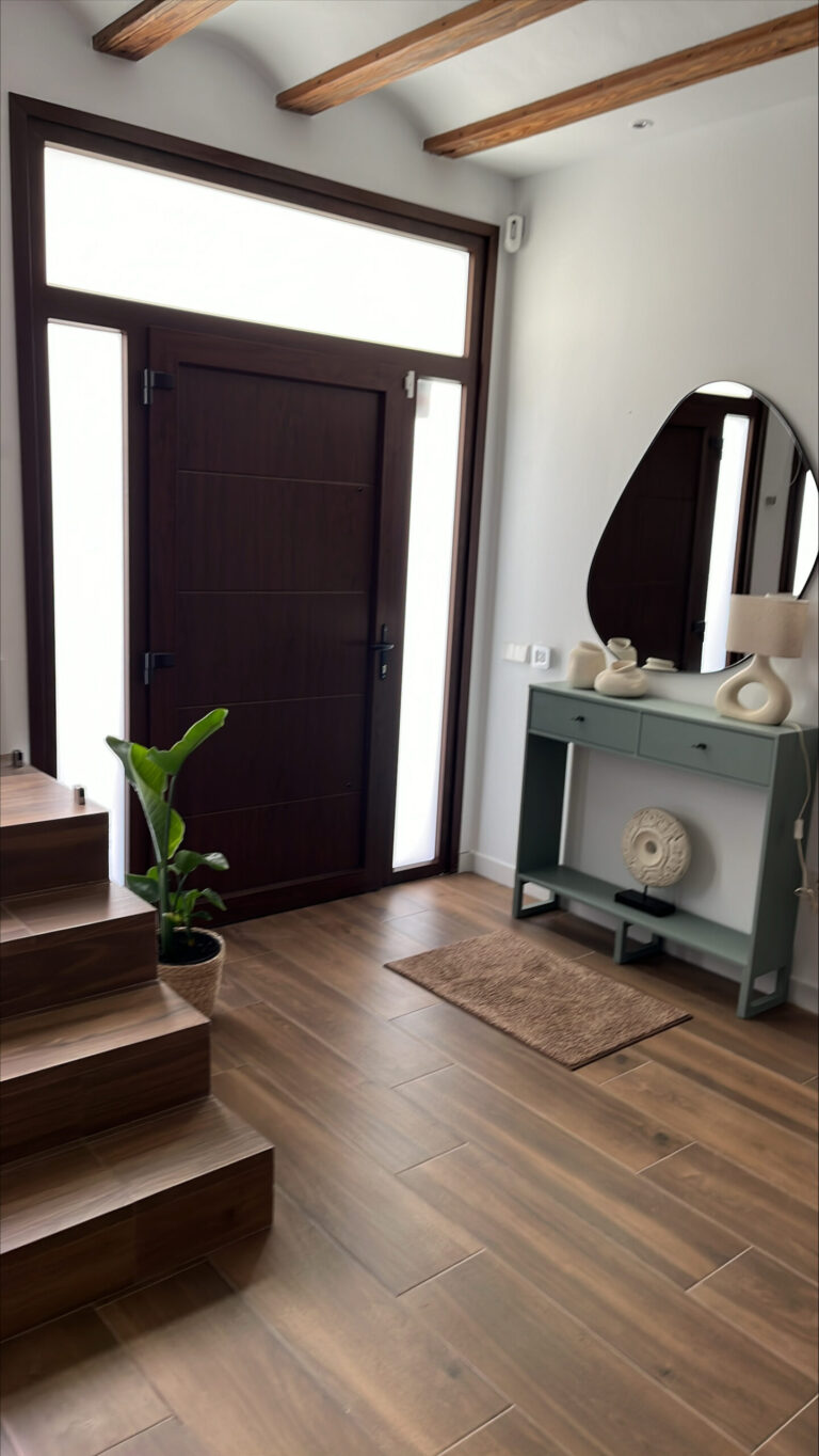 La escalera se transforma en un elemento central de la vivienda, revestida con porcelánico imitación madera y barandillas de vidrio que aportan ligereza y contemporaneidad al conjunto. El resultado es un equilibrio entre historia y modernidad, donde cada detalle ha sido pensado para dialogar con el carácter original de la casa.